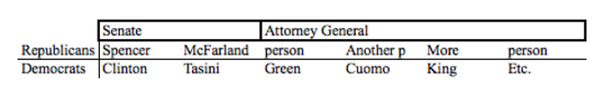 Instead, you find the party, scan along and have to find a candidate you recognize, then go up with your eye and try to find the job that sort of matches it. Except the jobs across the top take more than one column (Attorney General took four or five) and it’s really hard to grok the thing. Why is “Tasini” next to “Green”? Unrelated items should not be in the same row.