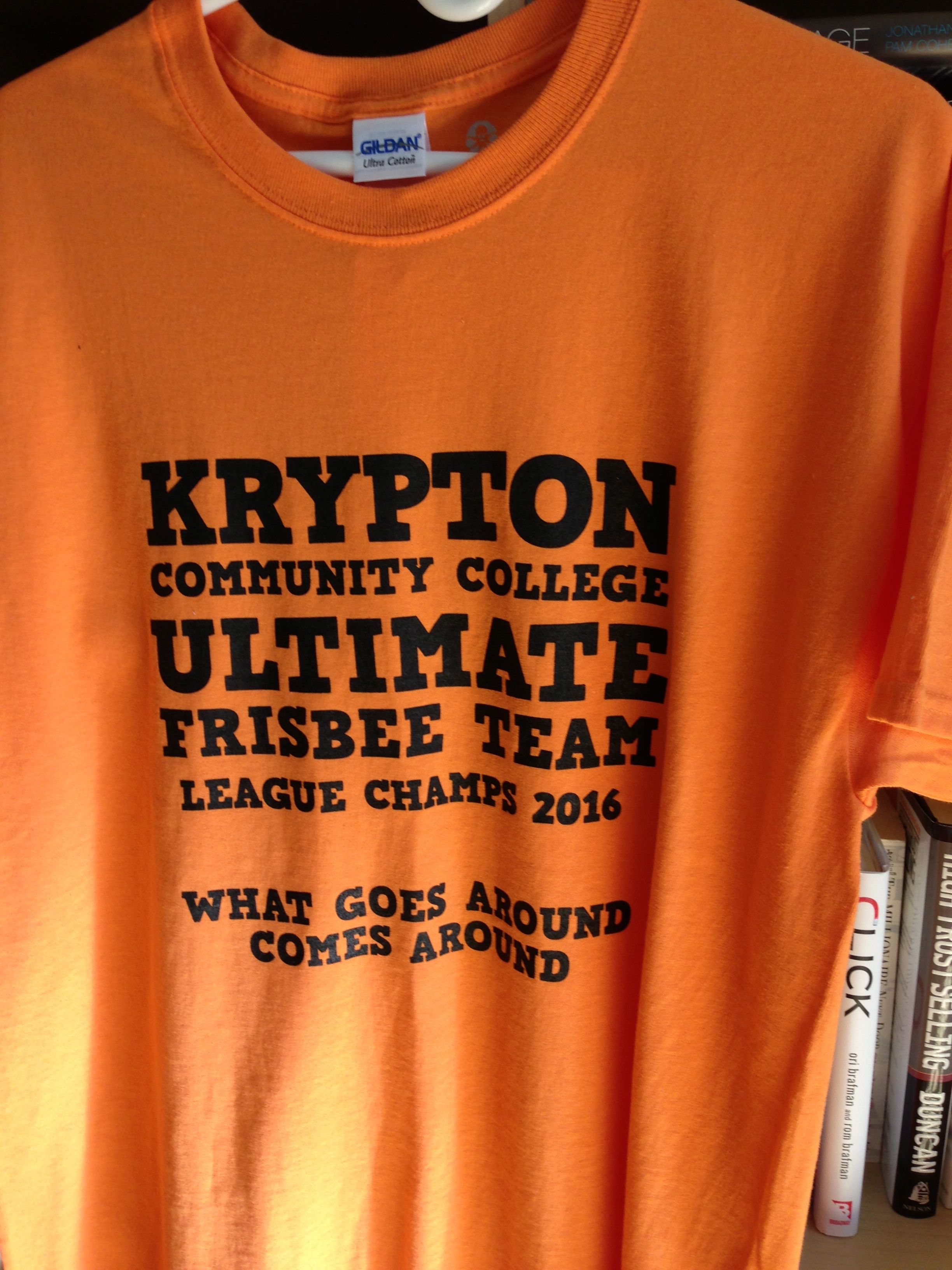 Here's what the interns looked like sorting through their limited-edition Krypton Ultimate Frisbee Team t-shirts ("league champs, 2016"). There are no more of these, but one day perhaps we'll make something even cooler.